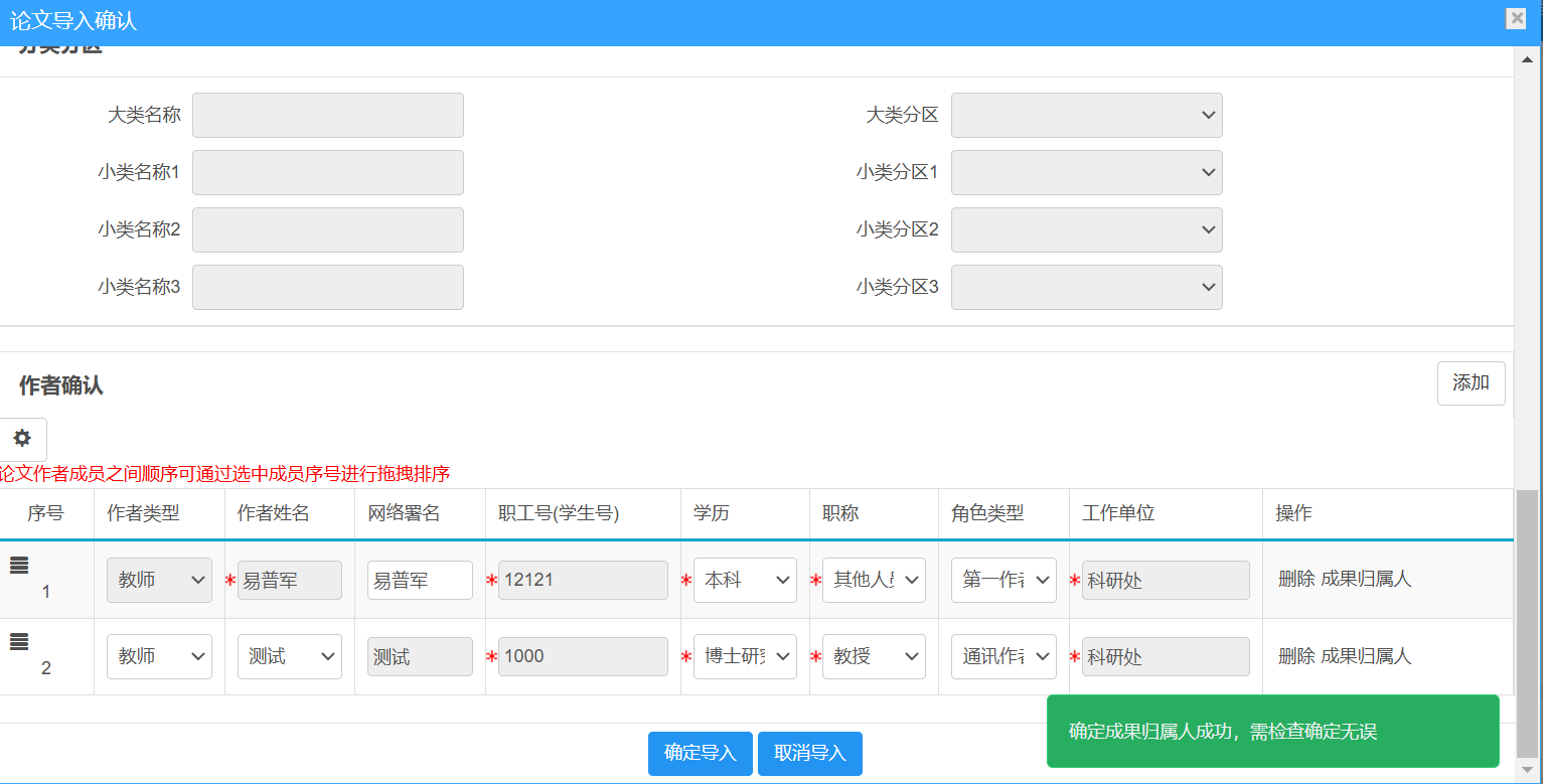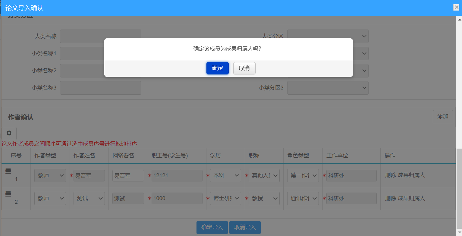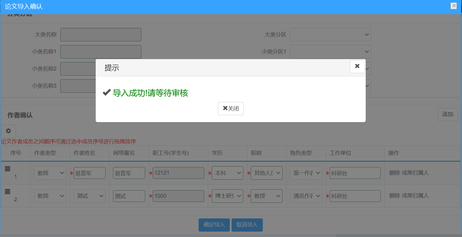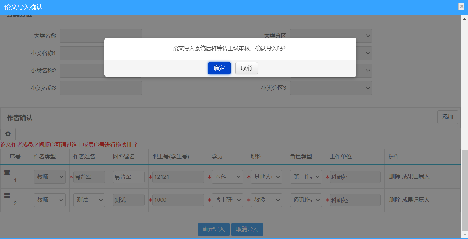 确认信息无误后,点击“确定导入”按钮。论文将提交学院和科研处审核,并进入正式库,状态显示为“已提交”。