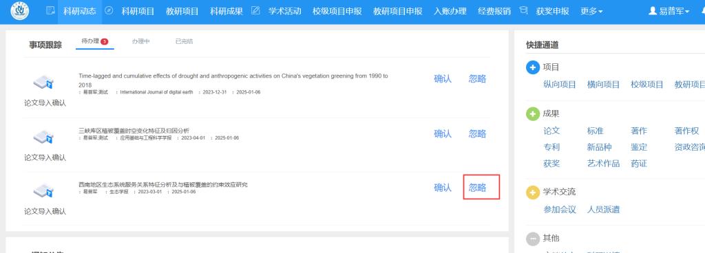 若推送的论文并非本人主持或参与,可点击“忽略”按钮,论文将从科研动态中移除,但在科研成果的“待确认网推论文”列表中仍保留,并标注为“已忽略”。