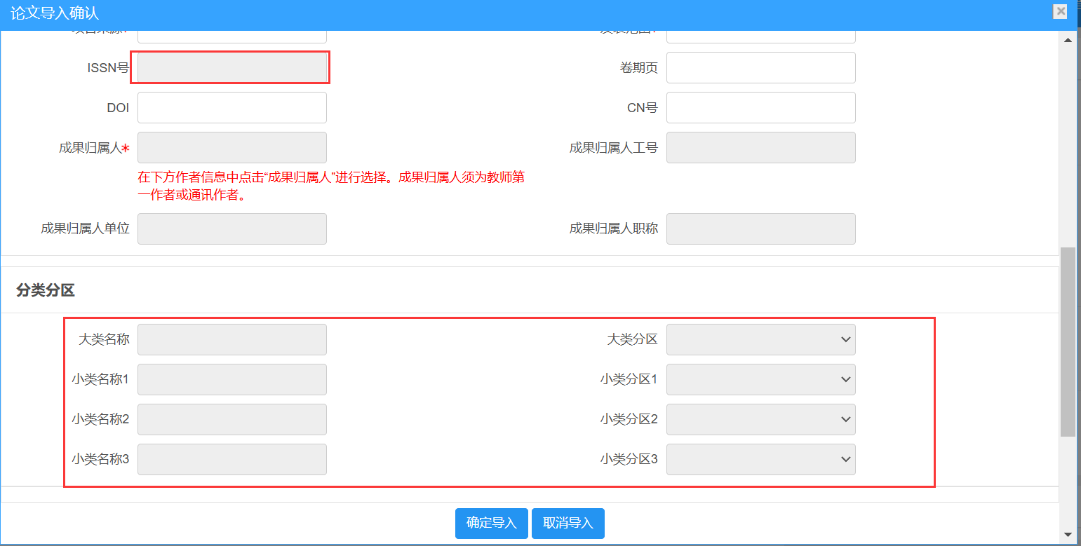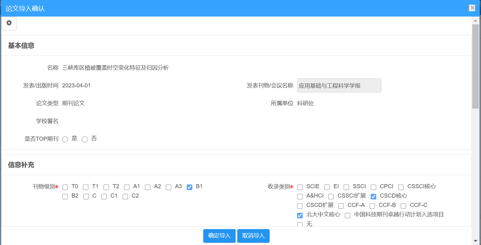系统会匹配系统中已存在的期刊信息并自动带出相关信息,如刊物级别、收录类别、教育部统计归属等信息,根据期刊自动带出的相关信息是不可编辑的。