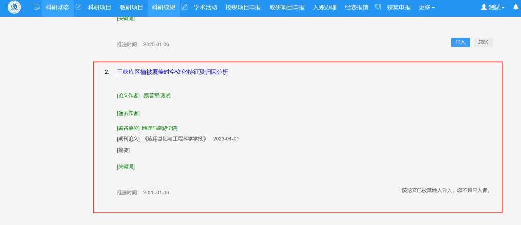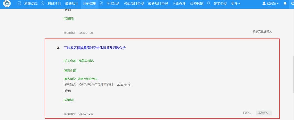 若发现导入错误,可在科研成果下点击“取消导入”按钮撤回操作。