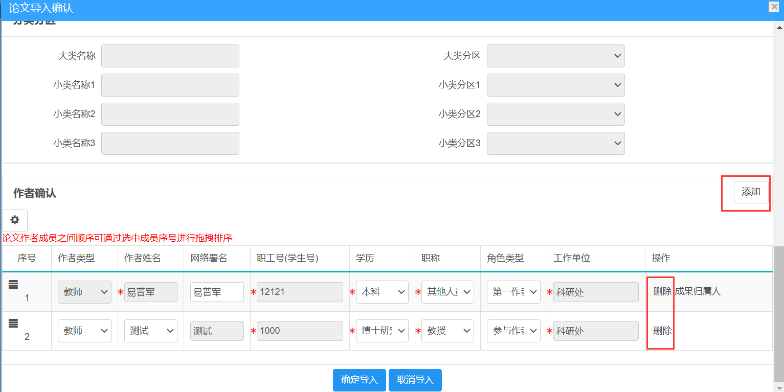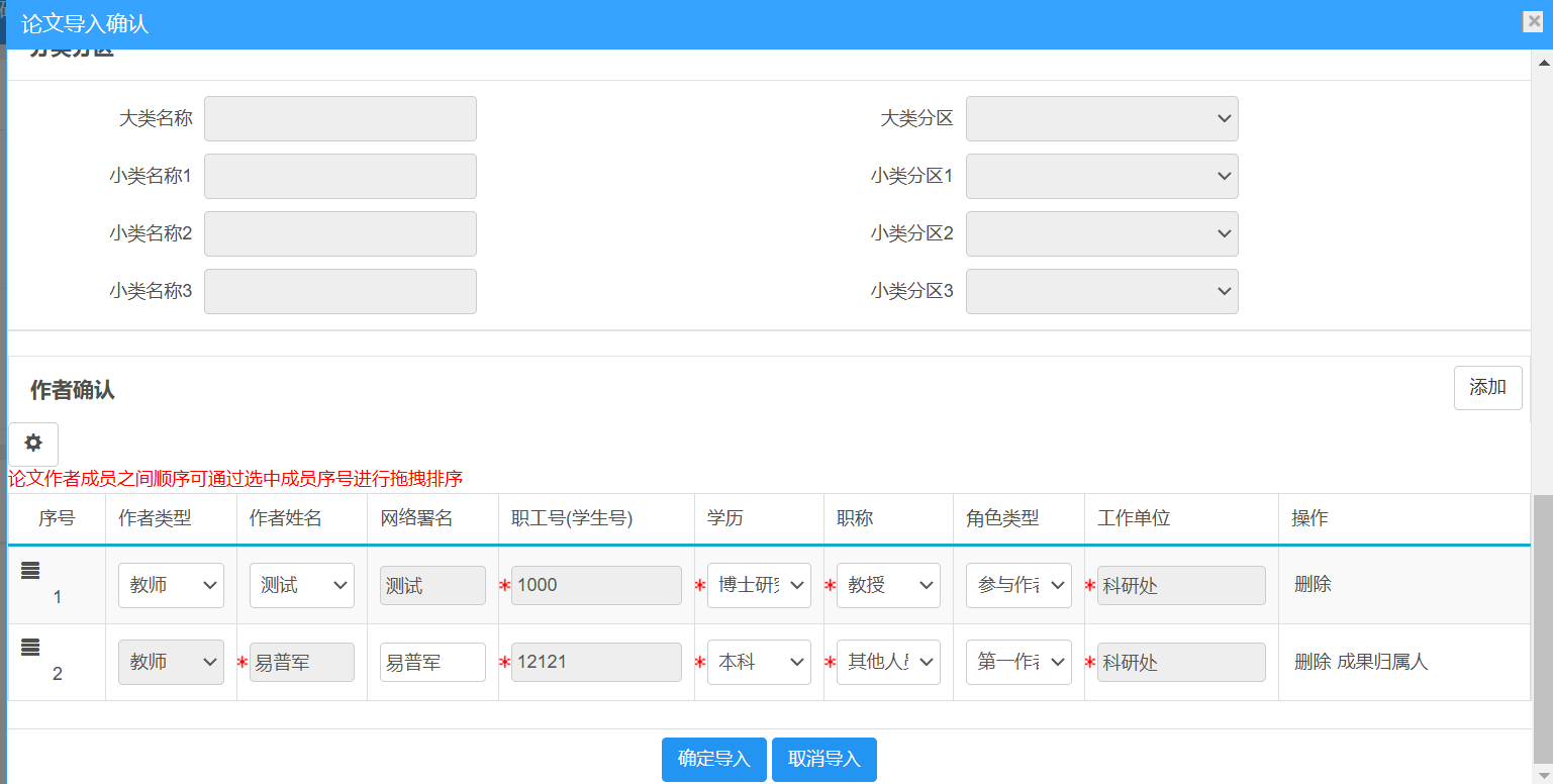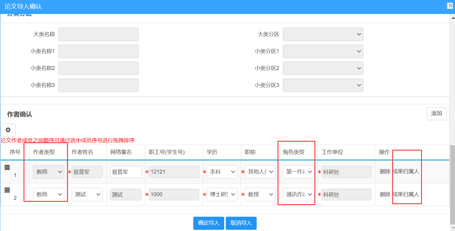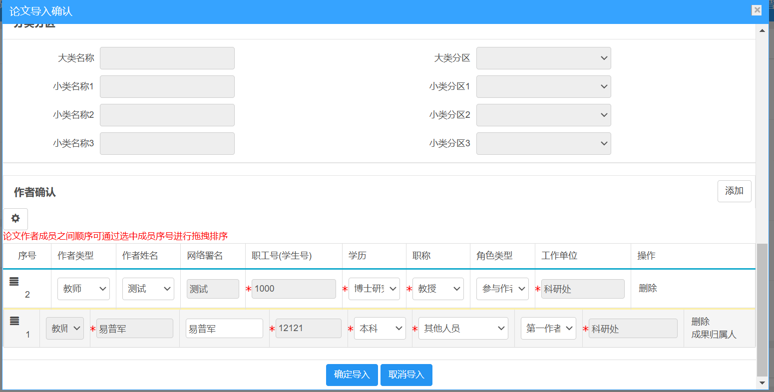 如论文作者顺序有误,可通过选中成员序号进行拖拽排序,如图
