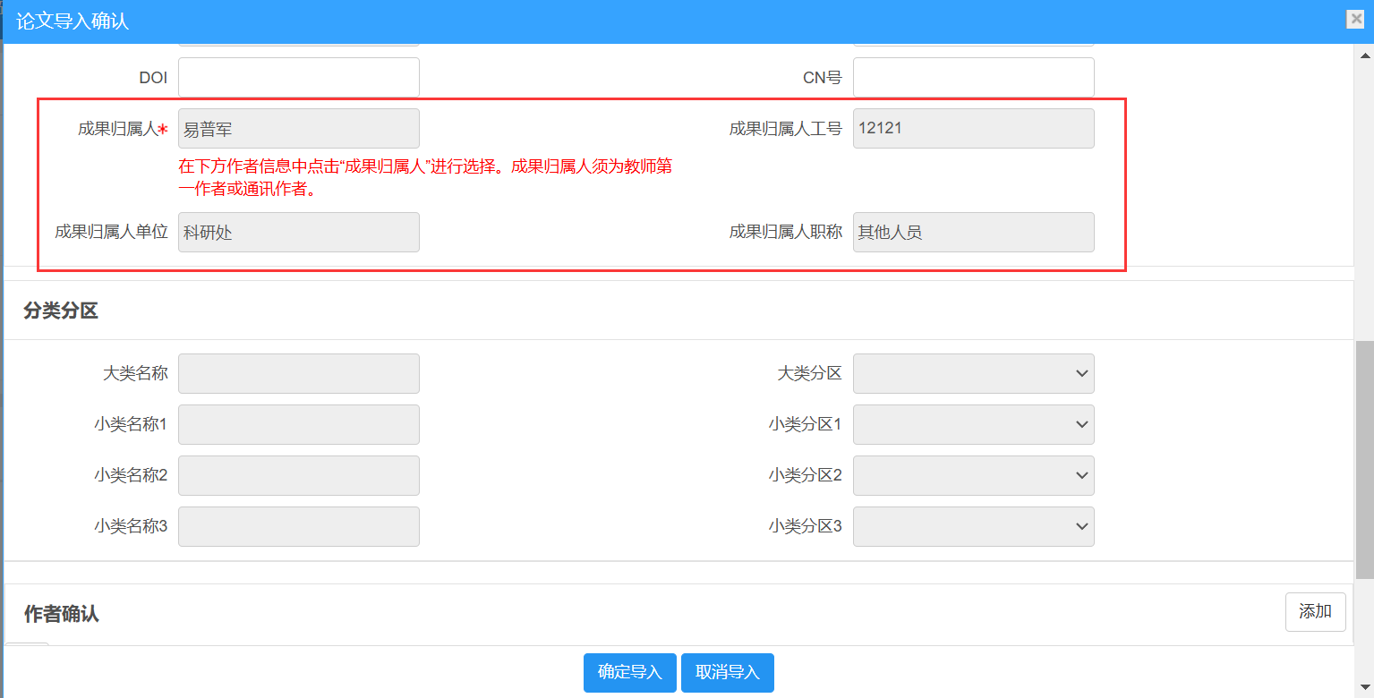 点击“科研动态”下的“确认”按钮,或“科研成果”下的“导入”按钮,进入论文认领页面。