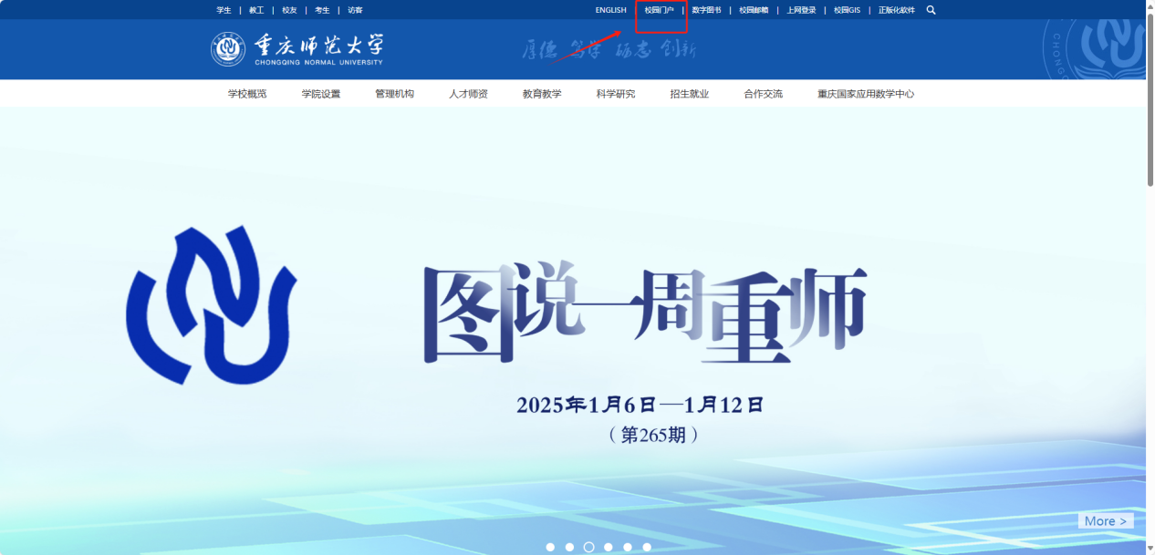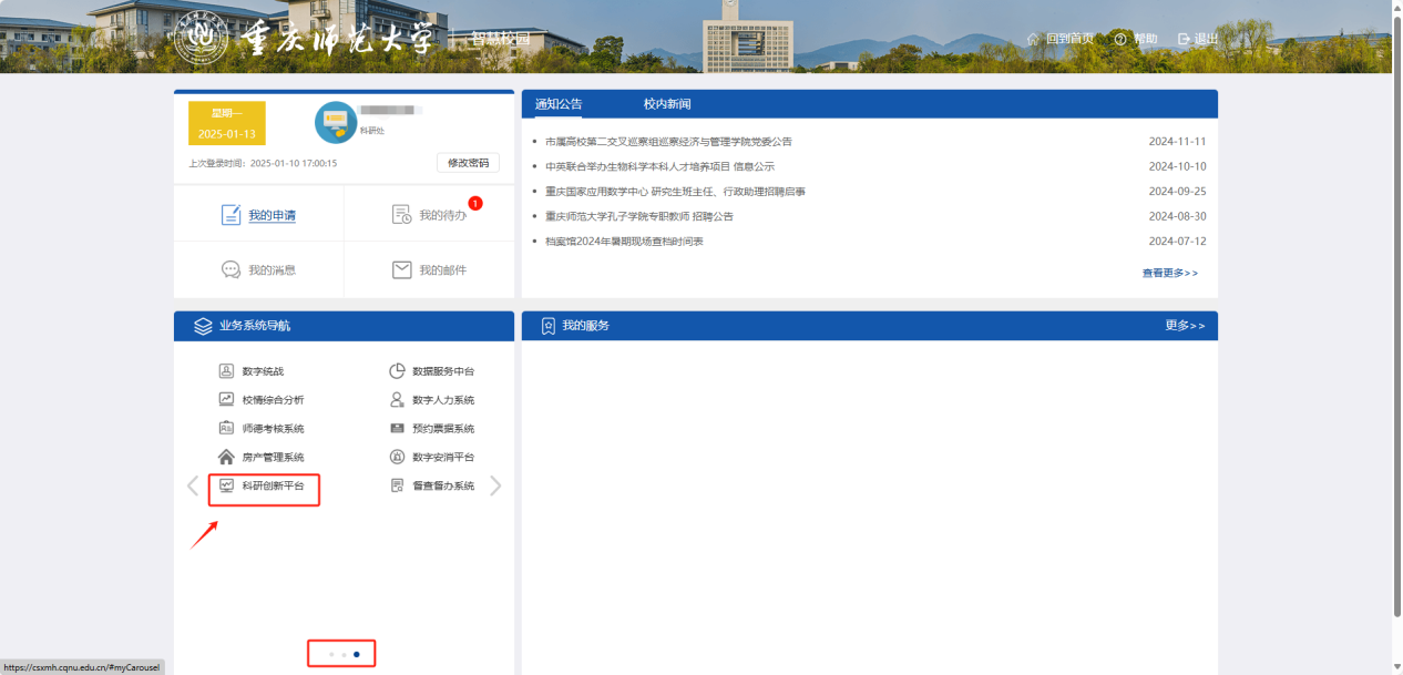 打开学校主页,点击右上角校园门户,登录后在业务系统导航中找到科研创新平台。