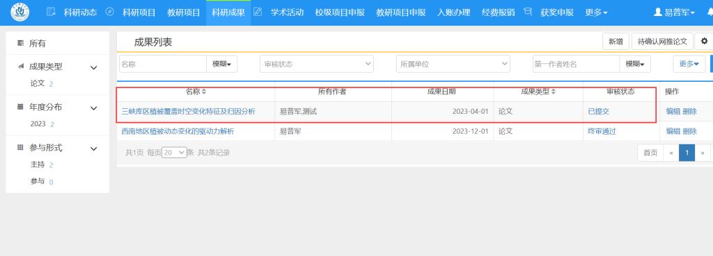 已提交的论文可在科研成果菜单中查看,状态显示为“已提交”,同时科研动态中的“待办理事项”转为“办理中”。