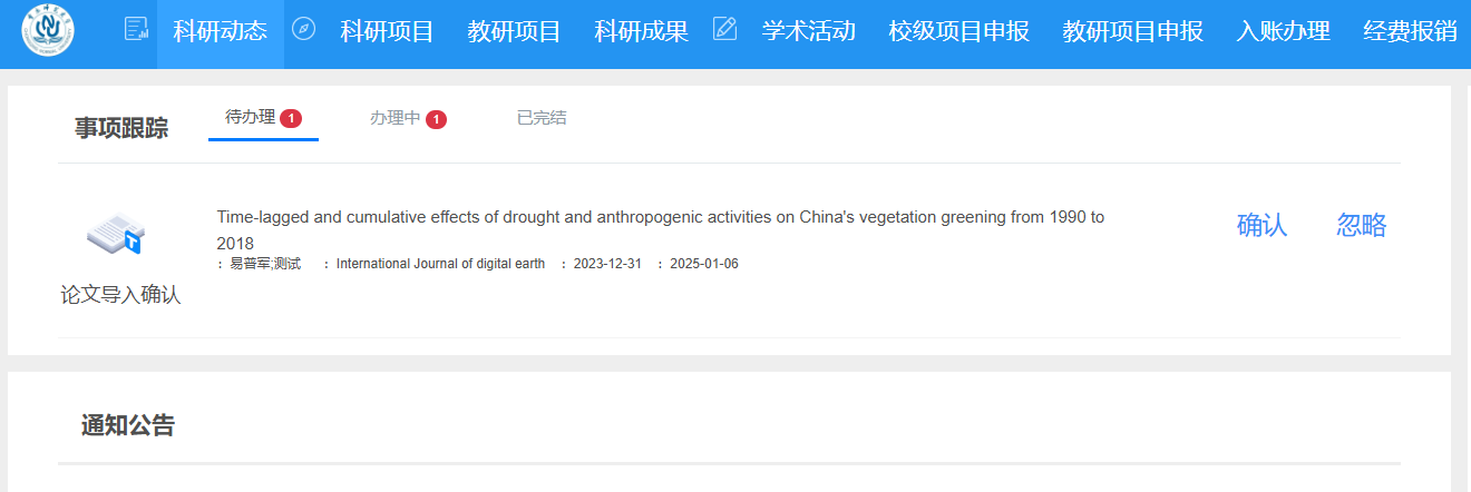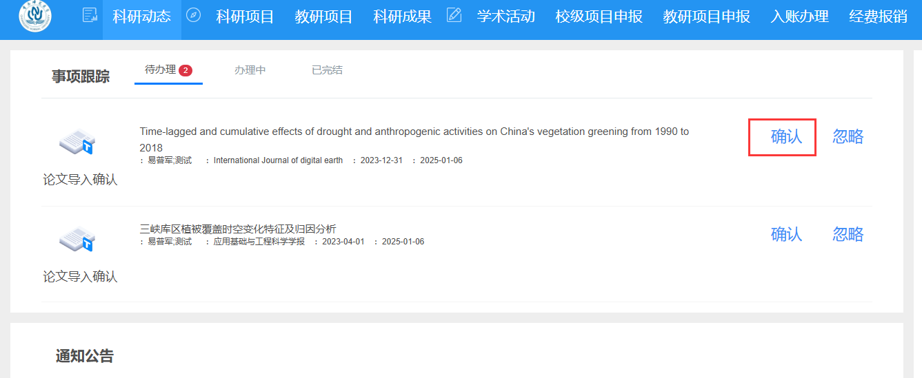 “科研动态” > 待办理事项:在该页面点击“确认”按钮认领推送论文。
