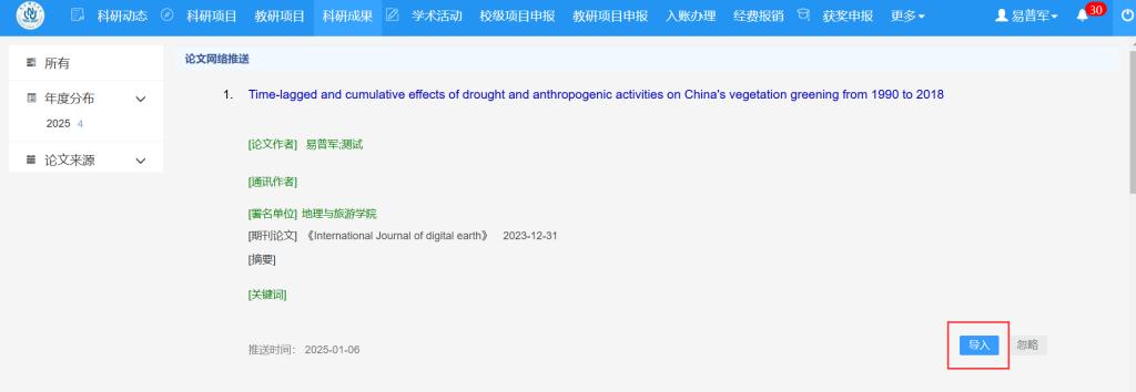 “科研成果” > 待确认网推论文:在该页面点击“导入”按钮完成认领操作。