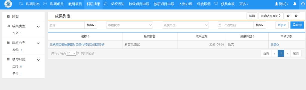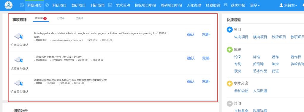 科研老师可通过科研平台中“科研动态”和“科研成果”菜单中的相应功能完成网推论文认领。具体操作如下:
