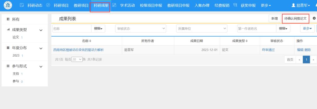 科研老师为论文作者之一:论文会出现在科研成果列表中,同时保留在“待确认网推论文”中。