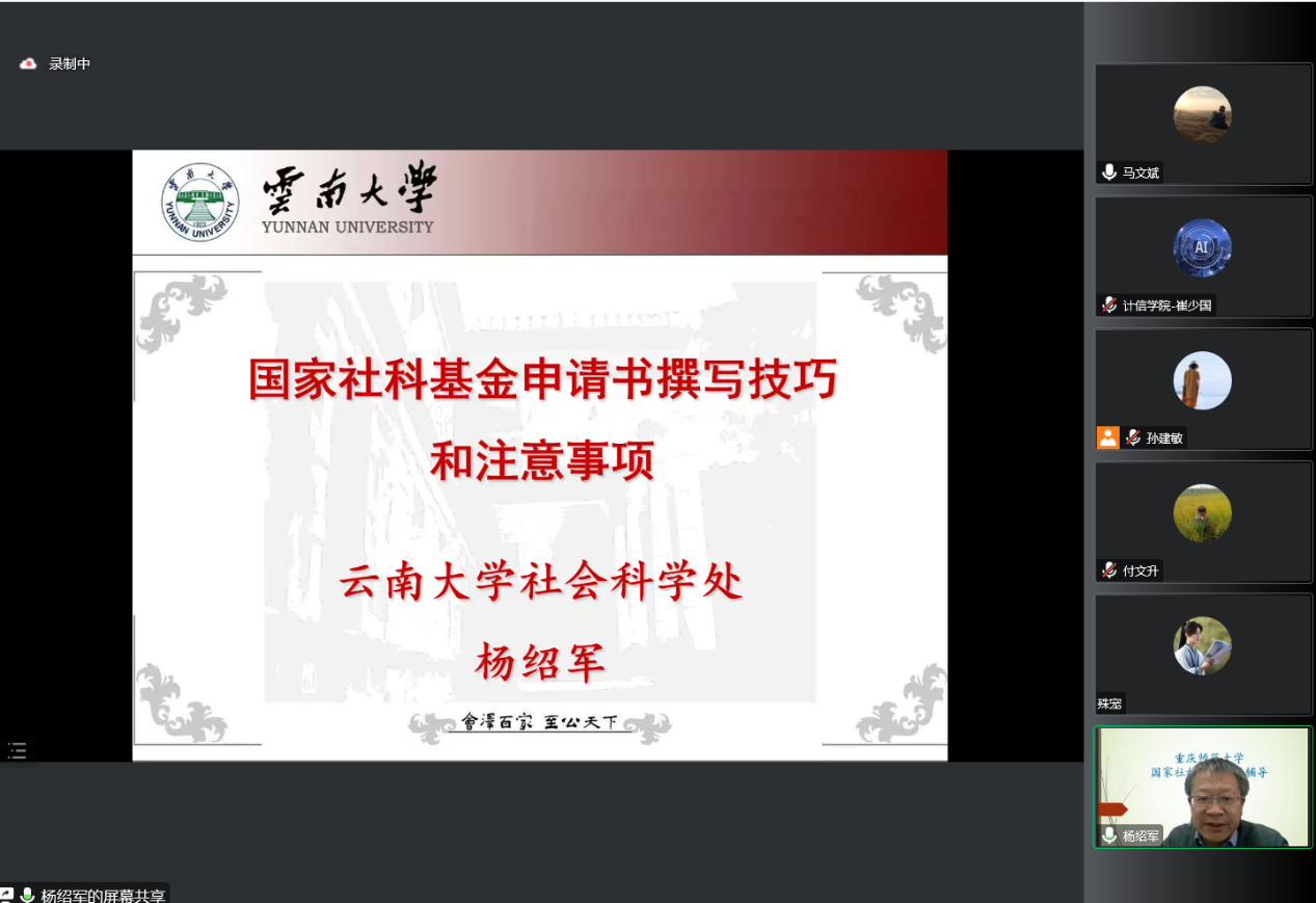 2022年11月24日下午,我校邀请云南大学社会科学处处长杨绍军教授开展主题为“国家社科基金申请书撰写技巧和注意事项”的线上辅导讲座。杨绍军教授从项目选题、项目申请书填写等方面进行了深入分析、并以云南大学获批项目为典型案例详细讲解项目申请书撰写技巧及相关填报注意事项。此次线上辅导讲座是我校国家社科基金项目申报系列辅导活动之一。根据教育部印发的《关于加强高校有组织科研推动高水平自立自强的若干意见》要求,我校持续做好有组织的科研,通过邀请专家举办辅导讲座、分学科类别辅导、一对一专项指导等系列活动,将国家社科基金申报辅导活动走向深入,争取在明年的立项上获得更大进步。