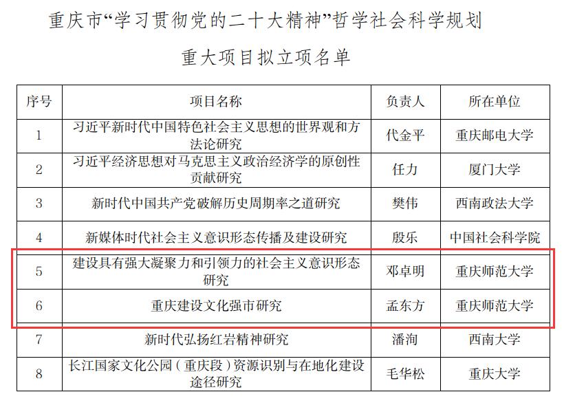 近日,重庆市社会科学规划办公室公布了重庆市“学习贯彻党的二十大精神”哲学社会科学规划重大项目立项名单,我校共获立2项(名单如下)。立项数排名第一。