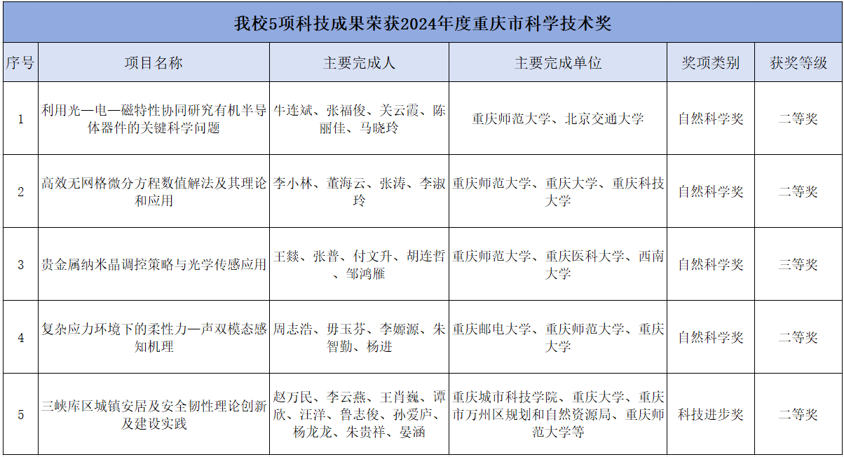 在本年度评选中,我校共荣获奖励5项,其中以第一完成单位获得3项(自然科学奖二等奖2项、自然科学奖三等奖1项),以参与单位获得2项(自然科学二等奖1项、科技进步奖二等奖1项)。