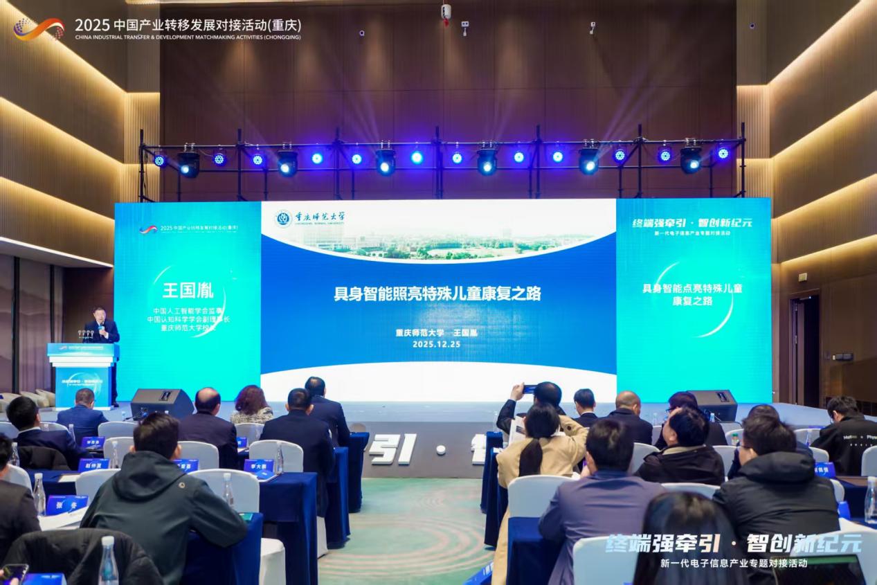 11月25日,由工业与信息化部、重庆市人民政府联合主办,重庆市经济和信息化委员会承办的2025中国产业转移发展专题对接活动在重庆悦来国际会议中心盛大召开。学校党委副书记、校长,中国认知科学学会副理事长王国胤教授受邀出席了此次盛会,并发表了题为《具身智能照亮特殊儿童康复之路》的精彩主题演讲。