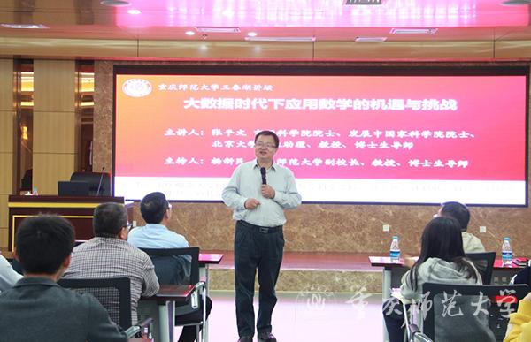 10月11日下午,中国科学院院士、发展中国家科学院院士、北京大学校长助理张平文教授做客“三春湖讲坛”,作题为“大数据时代下应用数学的机遇和挑战”的讲座。讲座由我校副校长、博士生导师杨新民教授主持。