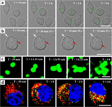 | 图. 胞内纳米颗粒单颗粒水平的动态成像。a)巨噬细胞摄入纳米银颗粒的动态过程(4小时连续观察);b)单颗粒纳米银的胞内运动实时示踪;c) 单颗粒水平胞内纳米银团聚过程;d)纳米银、细胞核和溶酶体的同时成像 |
