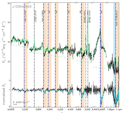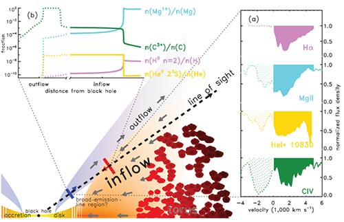 类星体吸收线技术对视线方向上气体的探测非常敏感,若内流气体恰好经过视线方向则非常可能被探测到。氢和氦是宇宙中最为丰富的基础元素,对气体示踪非常有效而且可诊断气体的物理状态。该课题组系统发展了氢和氦吸收线技术,首先应用于类星体外流和寄主星系星际物质的研究取得系列成果,并通过搜寻超过10万条类星体光谱成功发现了8个纯粹红移的氢和氦宽吸收线类星体,在运动学上直接证实气体达到吸积盘。另外,该课题组利用更多元素的吸收线特征联合解算光致电离模型得到的气体相对于吸积盘的位置、气体密度、厚度和电离度等物理参数均符合吸积模型预期,满足类星体吸积盘发光所需燃料供给要求。