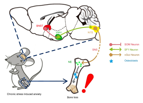该合作团队首先在人体实验中发现了密闭隔离的空间可以导致受试者出现明显上升的焦虑情绪与骨丢失症状,确认了压力应激与骨丢失的直接相关性,然后利用不可预测慢性轻度应激小鼠模型解析了压力应激诱发骨丢失的神经机制。研究结果显示,经过慢性压力应激刺激的小鼠表现出明显的焦虑样行为,同时伴有骨丢失;通过神经环路示踪技术、光遗传学调控技术、骨分析手段,成功解析出一条由终纹床核(BNST)的生长抑素神经元与下丘脑腹内侧核(VMH)的类固醇生成因子1神经元构成的神经环路,该环路通过调控孤束核(NTS)中的兴奋性神经元和外周交感神经活动来调节慢性压力应激诱导的骨丢失症状。当动物处于焦虑状态时,BNST的生长抑素神经元被激活,进而抑制VMH的类固醇生成因子1神经元活动;而这些被抑制的类固醇生成因子1神经元减弱了对下游NTS中囊泡谷氨酸转运体神经元的兴奋作用,促使外周交感神经系统活动度升高,分泌更多的去甲肾上腺素;这些去甲肾上腺素通过作用于骨细胞上的β2受体来抑制成骨作用并促进破骨作用,最终导致骨丢失。