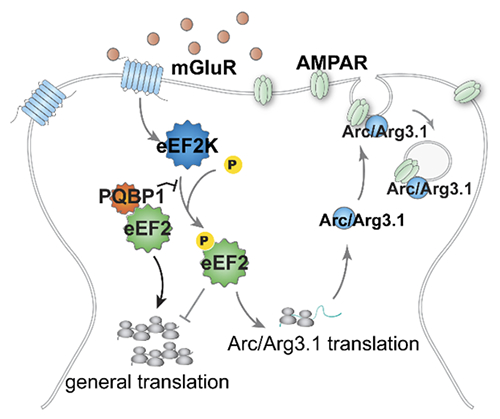 智力障碍是一种常见的神经发育障碍性疾病,X染色体的PQBP1基因突变会导致智力障碍和儿童孤独症,但是其致病机理尚不清楚。韩俊海研究团队制备了PQBP1基因的条件性敲除小鼠,发现在海马神经元中敲除PQBP1可导致认知功能显著下降,PQBP1竞争性地结合非磷酸化的真核延伸因子2(eEF2),抑制eEF2激酶(eEF2K)介导的eEF2磷酸化过程,调控代谢型谷氨酸受体依赖的突触长时程抑制(mGluR-LTD),提示PQBP1基因条件性敲除小鼠的认知功能障碍是由于mGluR-LTD受损所引起的。此外,在正常小鼠的海马中注射干扰PQBP1/eEF2结合的多肽,同样引起mGluR-LTD受损,导致认知功能障碍,并发现PQBP1通过抑制eEF2K介导的eEF2磷酸化调控蛋白质翻译的机制普遍存在。