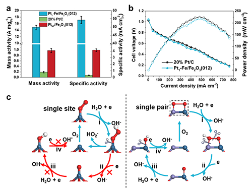 图1 (a) Pt-Fe原子对在0.95 V催化氧还原反应的质量活性和比活性;(b) Pt-Fe原子对在氢氧燃料电池中的极化曲线;(c) 单位点Pt和Pt-Fe原子对的催化ORR反应机理示意图