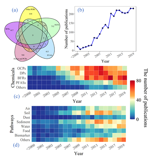 c) 不同类型POPs物质研究热度;d) 不同环境介质中POPs物质研究热度。