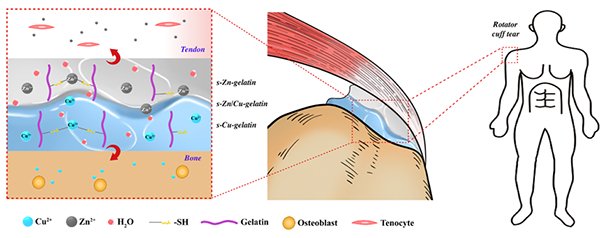 该研究利用两种金属离子与水凝胶体系进行层叠配位交联,实现了金属离子的空间梯度排布,可诱导腱骨界面处复杂组织结构的一体化重建,并具有良好的生物力学性能,为腱骨界面处的复杂组织损伤修复提供了新的治疗策略。